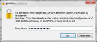 - Zuletzt muss noch ein Widerrufszertifikat erzeugt werden. Damit kann der Schlüssel bei Verlust widerrufen werden (besonders wichtig bei Schlüsselservern). Das sorgt dafür, dass andere Nutzer wissen, dass Mails nicht mehr mit diesem Schlüssel verschlüsselt werden sollten. Um das Zertifikat zu erzeugen muss der Schlüssel mit dem Passwort entsperrt werden. Die Zertifikatsdatei sollte an einem sicheren Ort gespeichert werden.