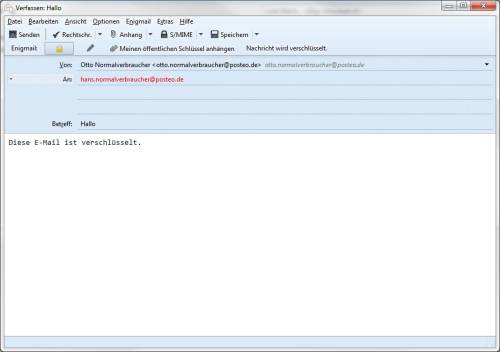 - Um eine Mail zu schreiben verfassen wir ganz normal eine Mail und achten auf das Schloss von Enigmail. Dort kann man auswählen, ob die Mail verschlüsselt werden soll.
